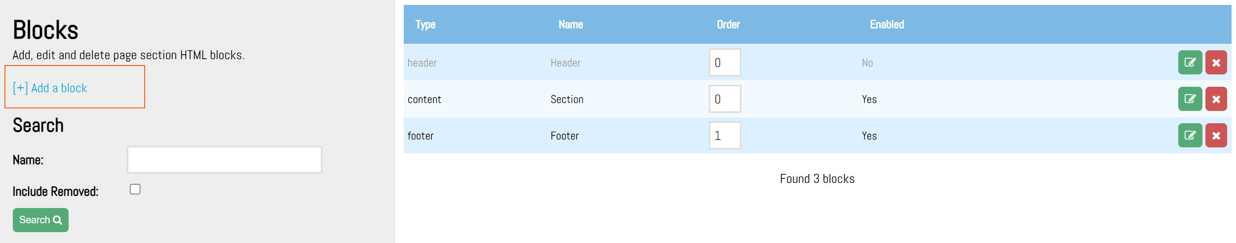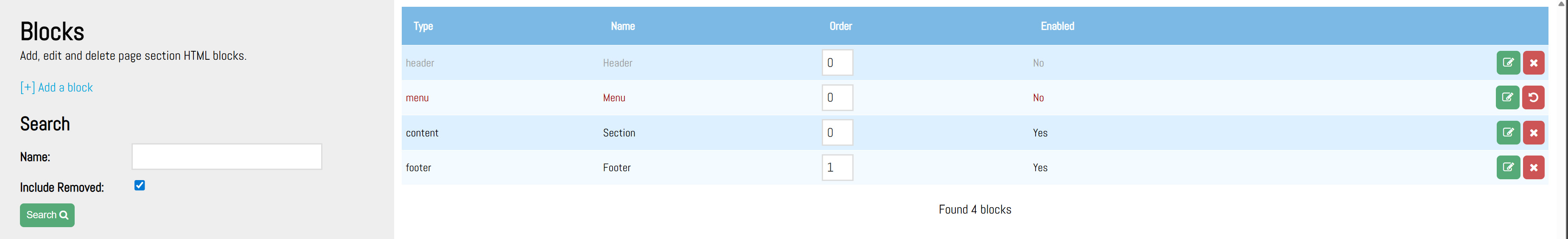 Once a new block has been added, it will show in the list of blocks.The default state for a new block is disabled (not viewable by the public). A disabled block will show as greyed out in the list.All blocks can be re-ordered using the order column with the lowest number being at the top of the list.