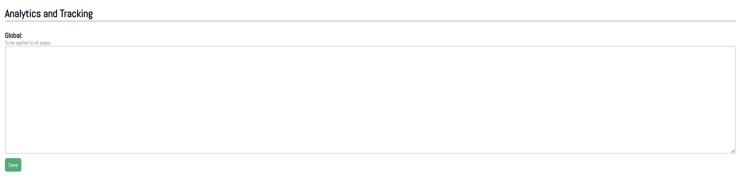 Add tracking code to the website. Google or Facebook analytics tracking code can be added here. This will apply to all pages on the website (global). This can also be used to add global JavaScript that needs to be applied sitewide.Save Button