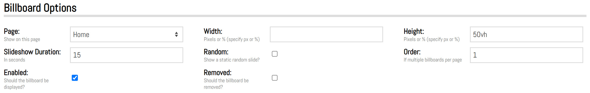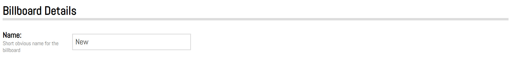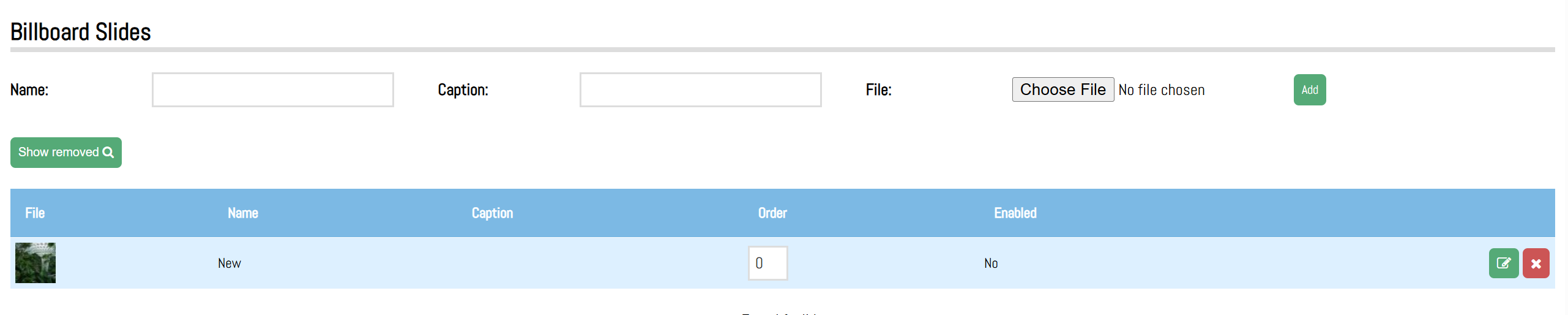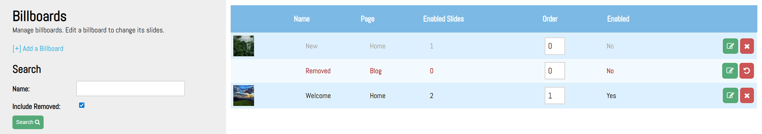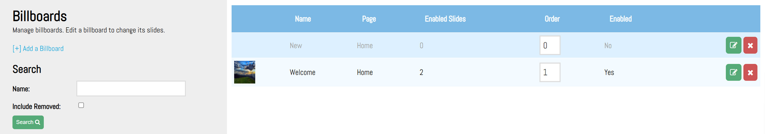 Once a new billboard has been added, it will show in the list of billboards. The default state for a new billboard is disabled (not viewable by the public). A disabled billboard will show as greyed out in the list.All billboards can be re-ordered using the order column with the lowest number being at the top of the list.