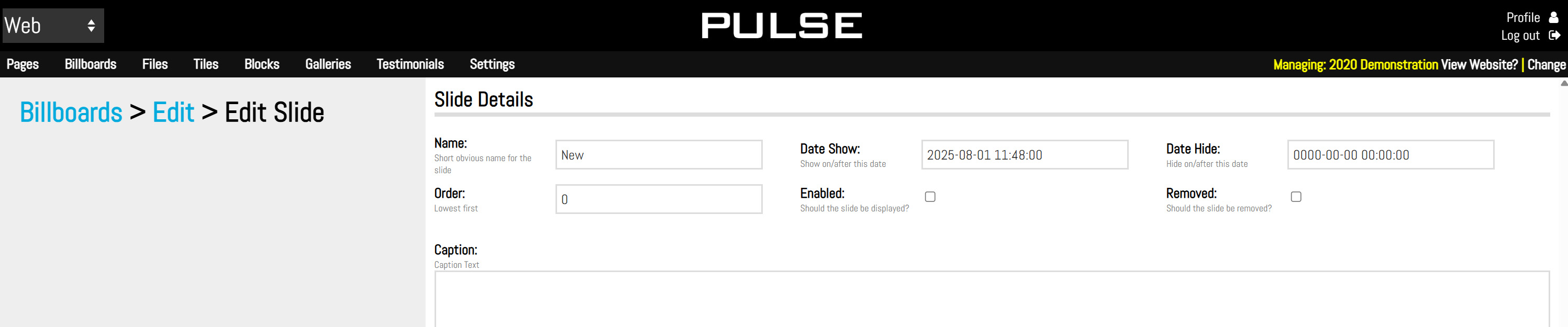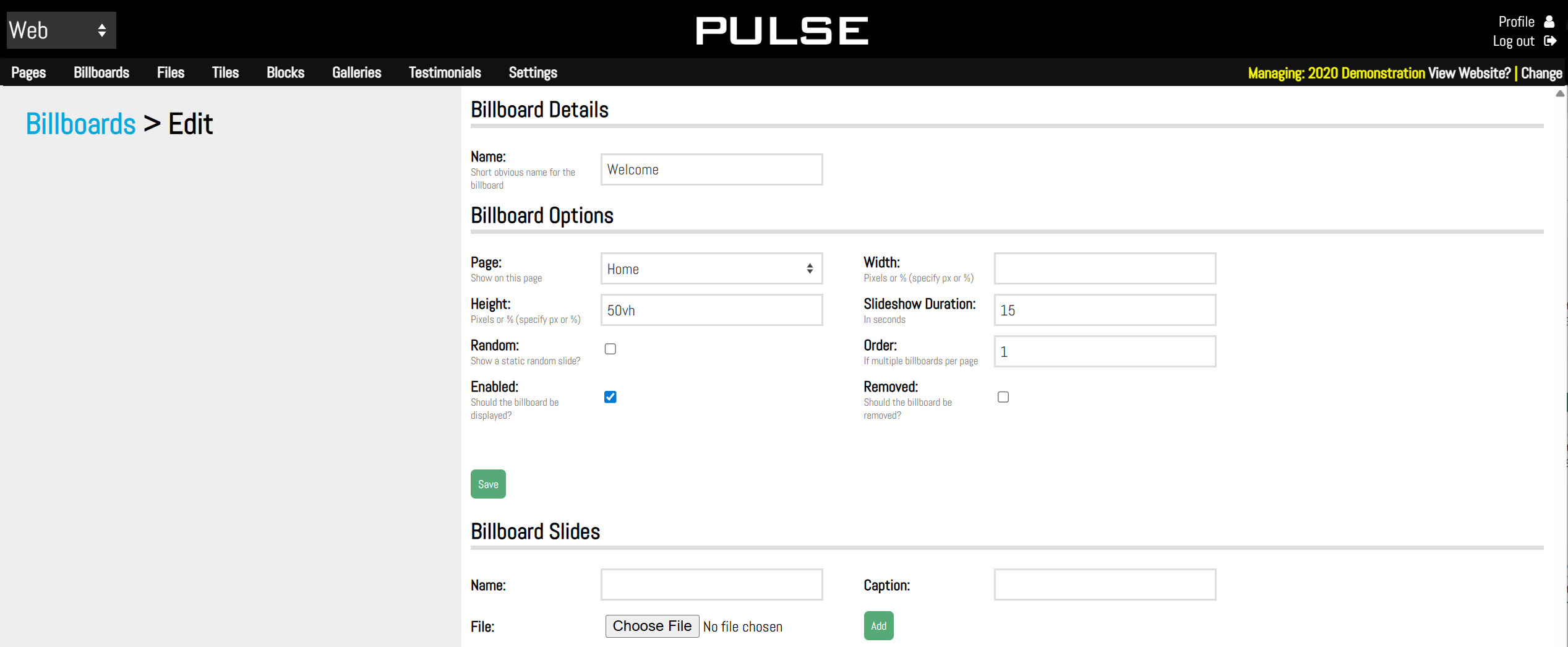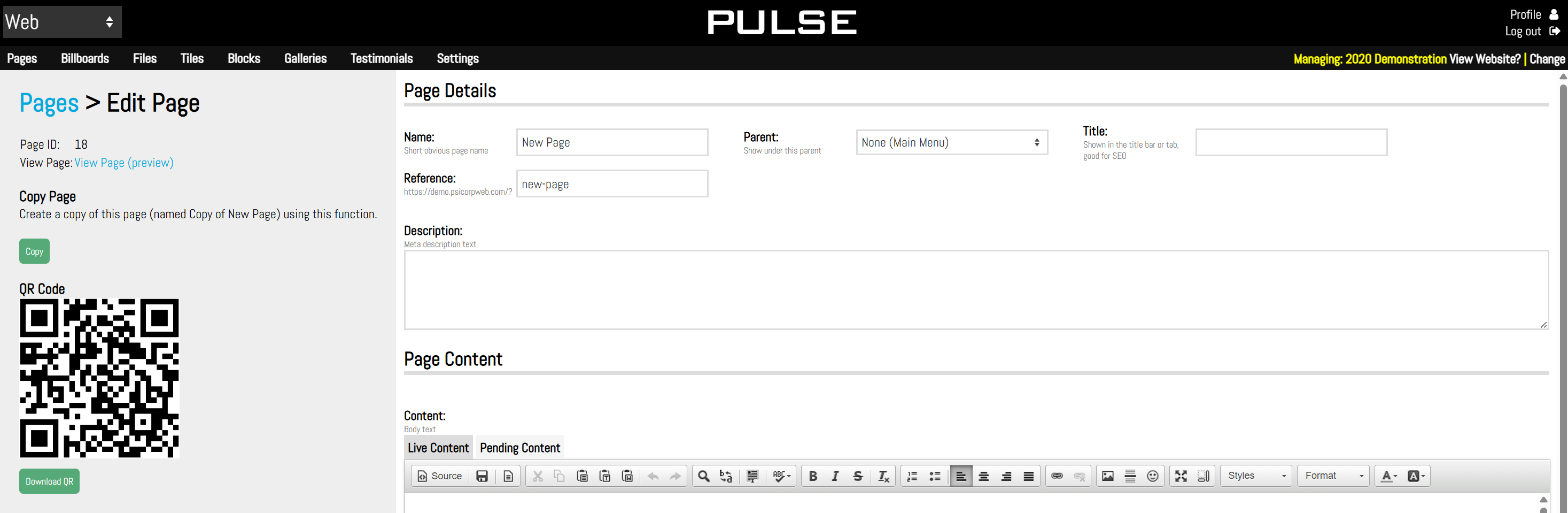 The web module is where changes can be made to the website. This is split into Pages, Billboards, Files, Tiles, Blocks, Galleries, Testimonials, and Settings. Each area is designed to modify a specific portion of the website. This guide will go over all of these areas in detail.This guide is for PULSE version JUN2025. Some things will apply to older versions but check which version you are on if some features are missing.