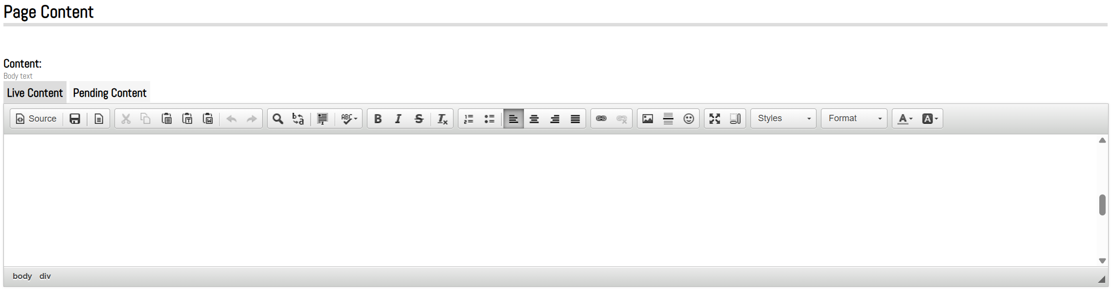 There are two tabs for Live Content and Pending Content where content can be worked on and updated before setting it live. To use pending content, the source content from the Live content tab needs to be copied into the source of the pending content tab.