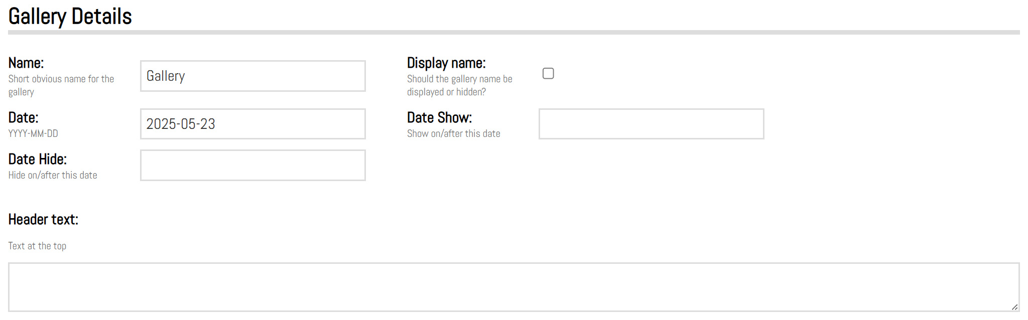 Checkbox to show or hide the name on the gallery page in the front end.Date