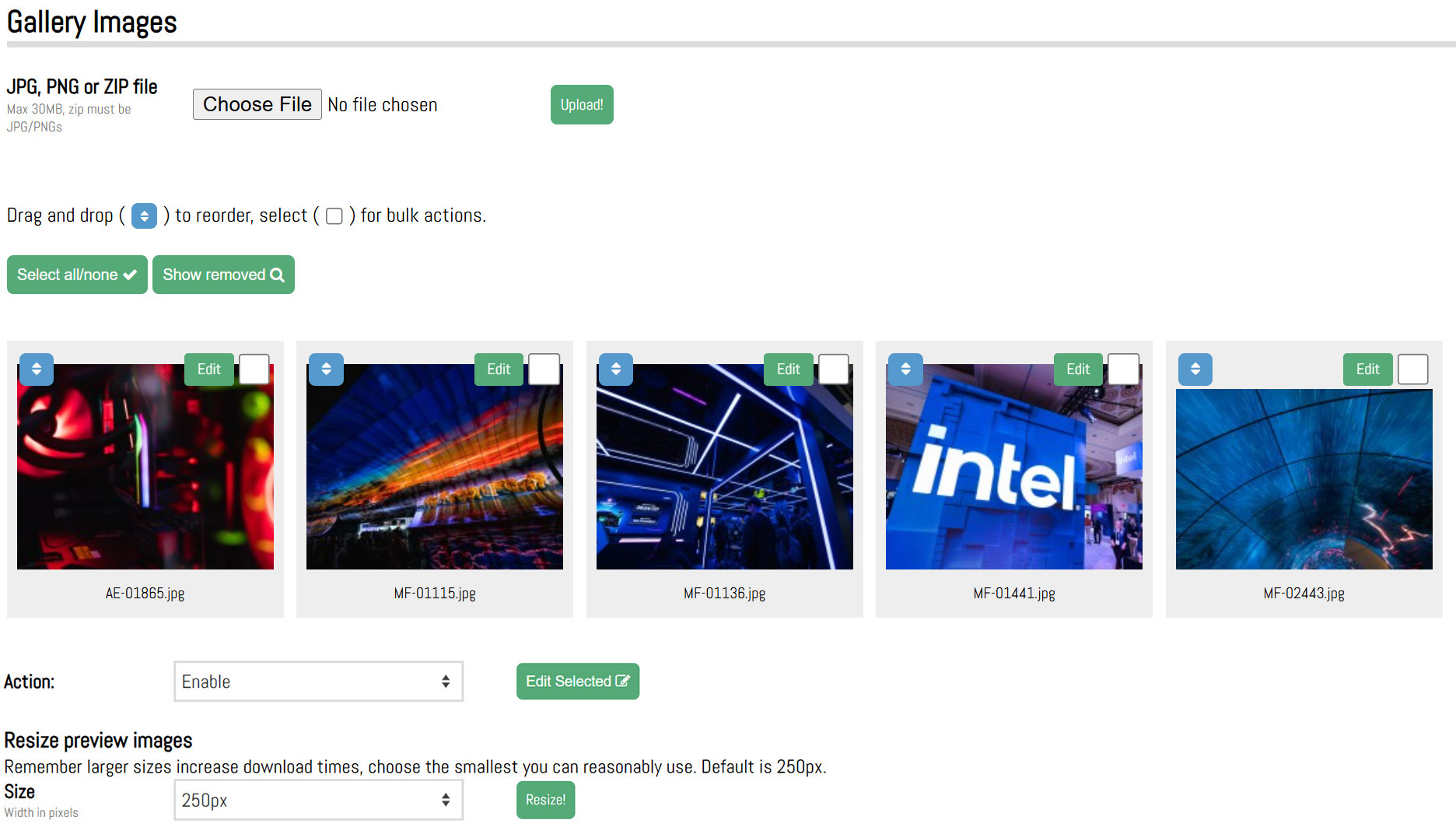 Click choose file to add individual images or a zip file of multiple images to the gallery. Images once uploaded, can be dragged and dropped to be re-ordered.