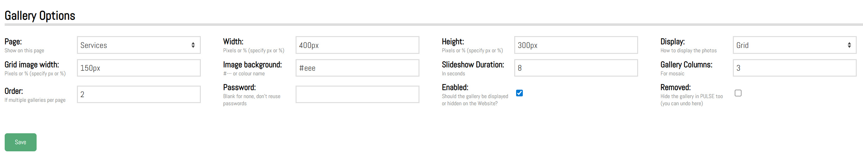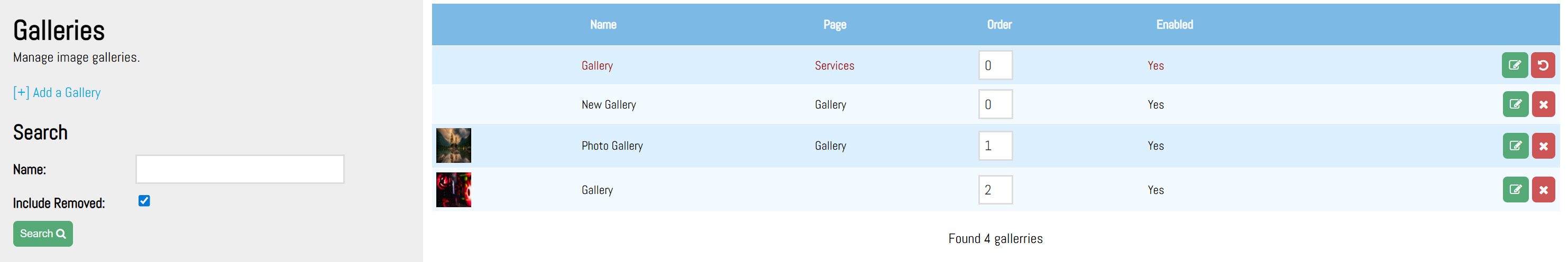 Once a new gallery has been added, it will show in the list of galleries. The default state for a new gallery is disabled (not viewable by the public). A disabled gallery will show as greyed out in the list.All galleries can be re-ordered using the order column with the lowest number being at the top of the list.