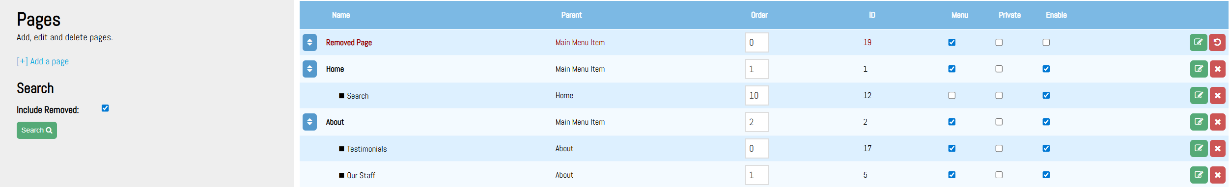 Once a new page has been added, it will show in the list of pages. The default state for a new page is disabled (not viewable by the public). A disabled page will show as greyed out in the list.Main menu pages can be re-ordered by dragging and dropping. All pages can be re-ordered using the order column with the lowest number being the top of the list. Re-ordering only applies to a grouping of pages belonging to the same parent.