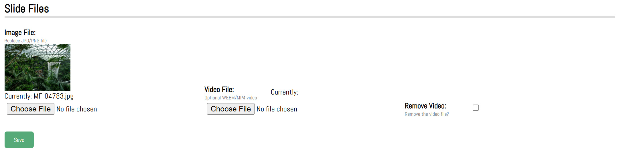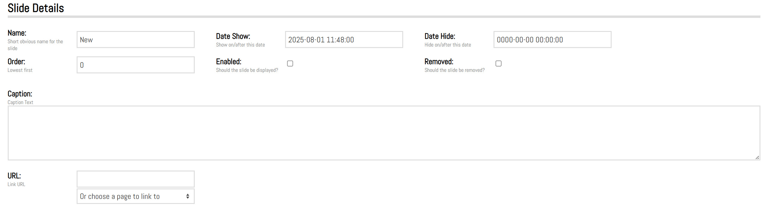To schedule a slide, the enable check box must be checked. If there is a date set in date hide field, the slide will be disabled however it will still show as checked (enabled). This can be unchecked at any point and the date can be removed to clean up if desired.Slide Files