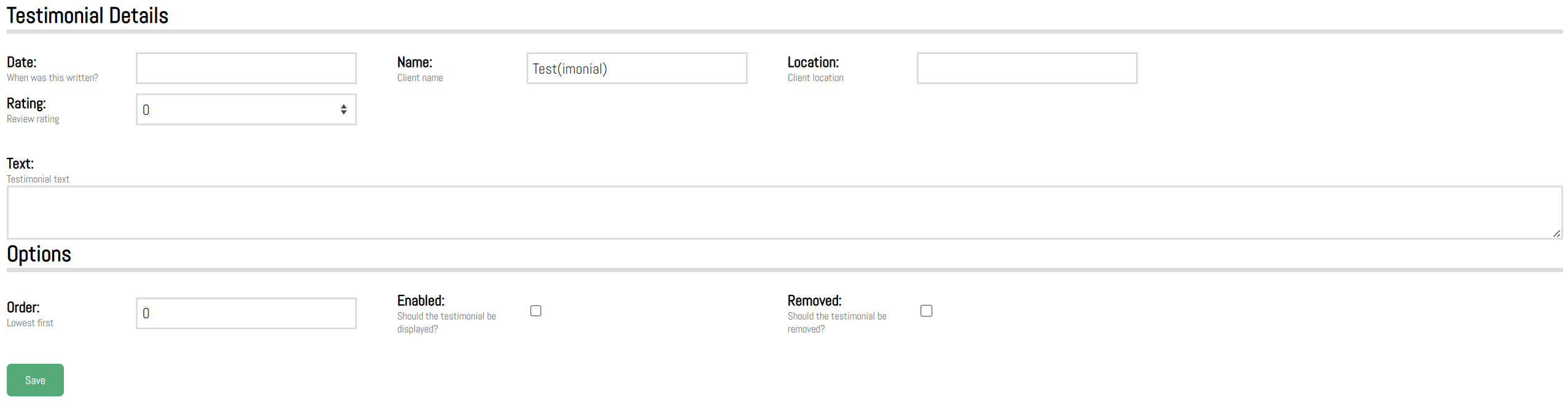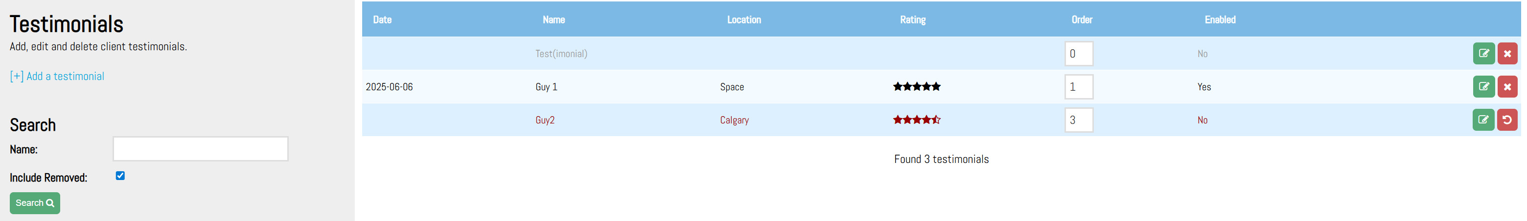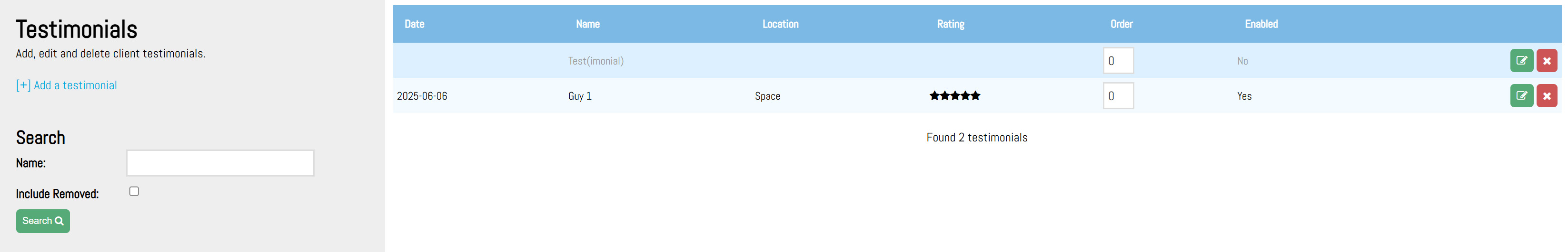 Testimonials will show in the list. The default state for a new testimonial is disabled (not viewable by the public).A disabled testimonial will show as greyed out in the list.