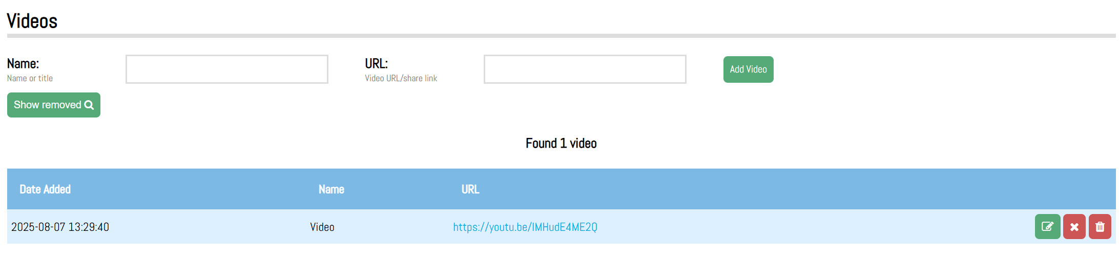 Click on the green edit button to edit the video details including: name, url, order, enable/disable, and remove.